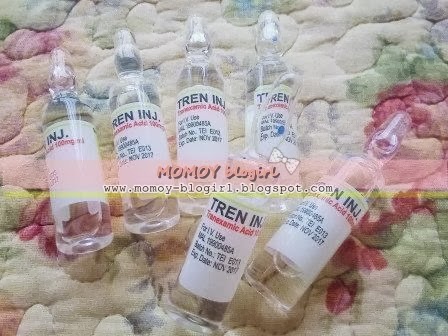 Nak cerita sikit cara Momoy suntik tranexamic acid. Momoy inject setiap minggu. Nak senang ingat Momoy akan inject setiap hari Ahad. So far, sampai sekarang tak pernah skip lagi. Momoy combine tren dan vitamin c. Doktor tu mix kan tranexamic acid dan vitamin c dalam satu picagari sederhana. Maknanya, sekali cucuk jer la.